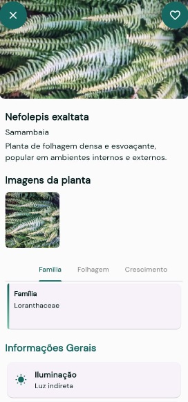 - O app também exibirá informações detalhadas sobre a espécie, como cuidados necessários, curiosidades e muito mais.
